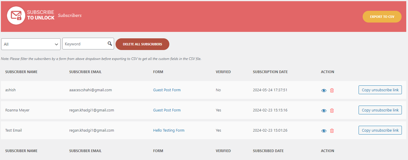 In this section, you can view all the subscribers that have subscribed through the different subscription forms and also filter the subscribers as per the different subscription forms and also export them to CSV for further external use.